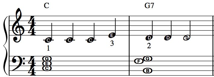 In Measure 1, the C major chord is played with the first middle C. You would continue to hold the C chord while you played the remaining 3 melody notes with your right hand.